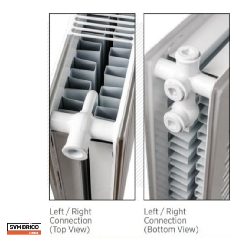 The radiator is equipped with side and bottom connections allowing for mounting flexibility. It can be connected via a T-connection system offering various installation options.